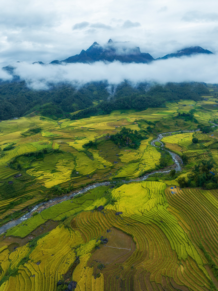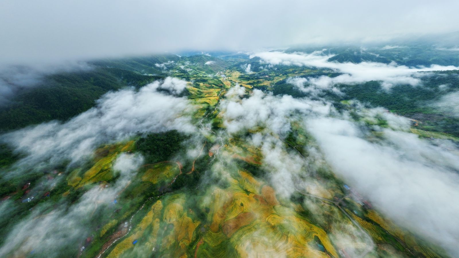 Harvest season at the foot of Ky Quan San Mountain creates an overwhelmingly marvelous scene. The Ky Quan San mountain range is located on the border of Lai Chau and Lao Cai, with the 3,046-meter high Ky Quan San peak the fourth highest in Vietnam.