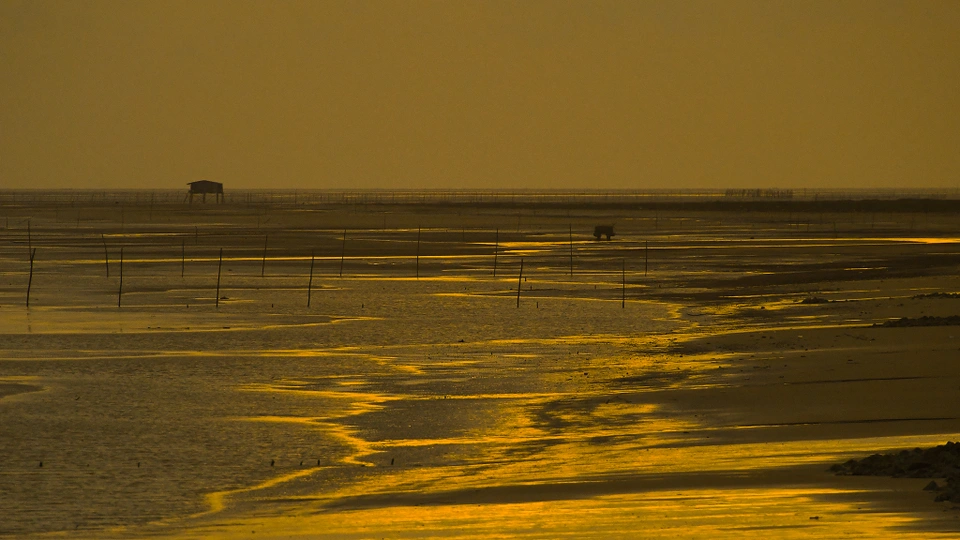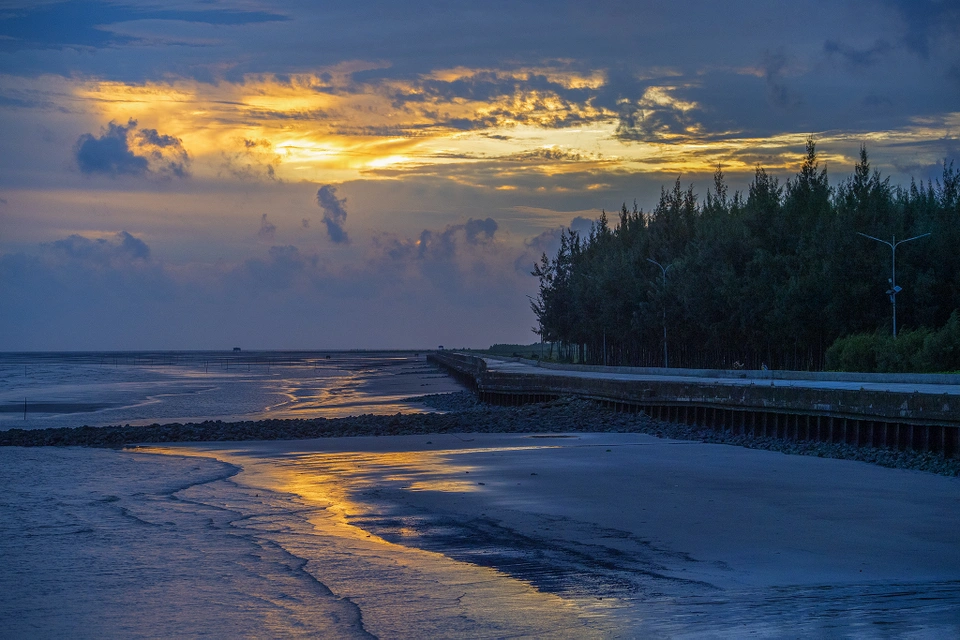 Biển Khai Long nằm uốn mình theo mũi Cà Mau, nhìn từ xa bãi giống như một tấm lụa mềm mại uốn lượn nhẹ nhàng.
